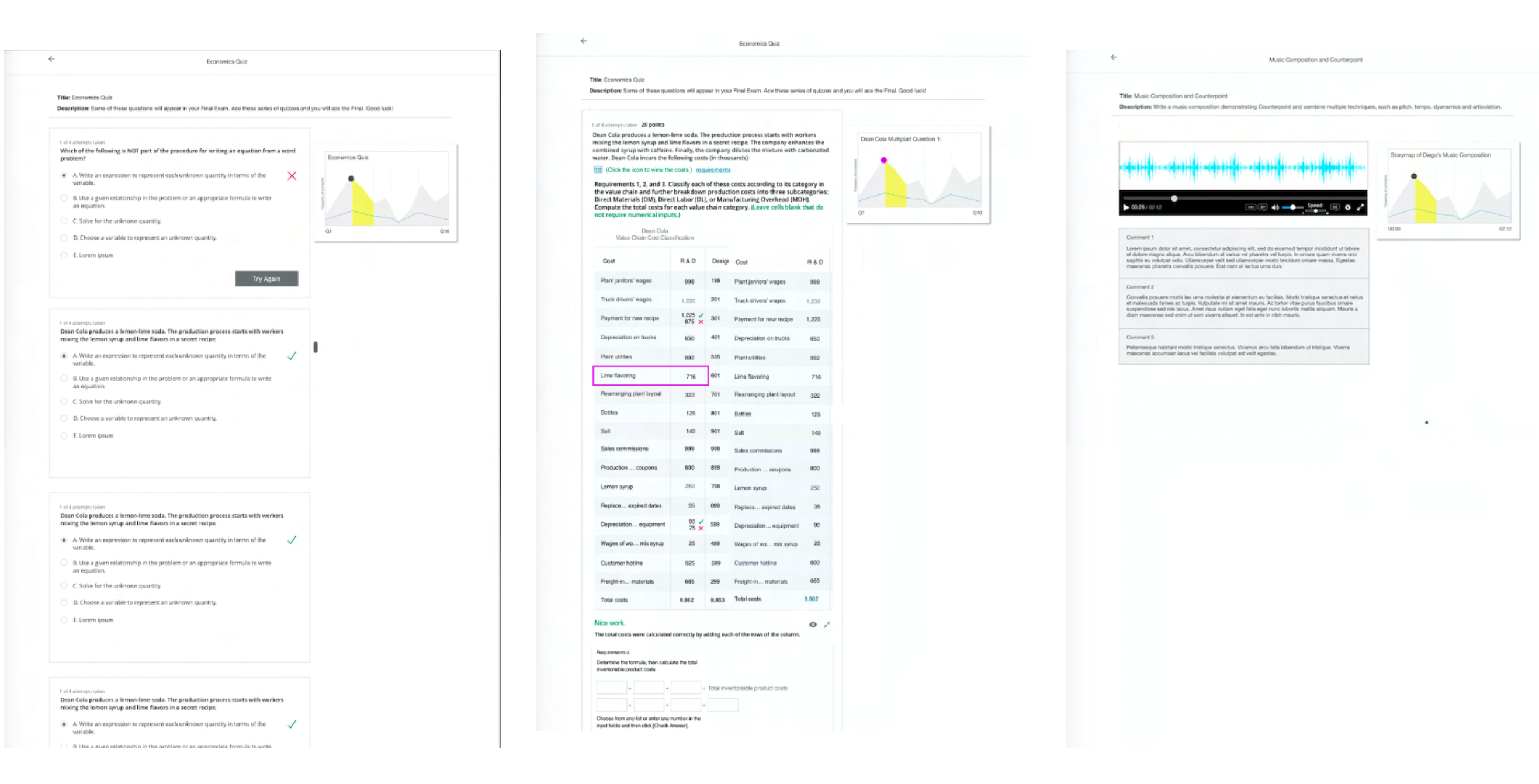 More UI screens of how contextual comments would work in feedback for a quiz, comment in a table cell for a business textbook, and commenting on an audio player.