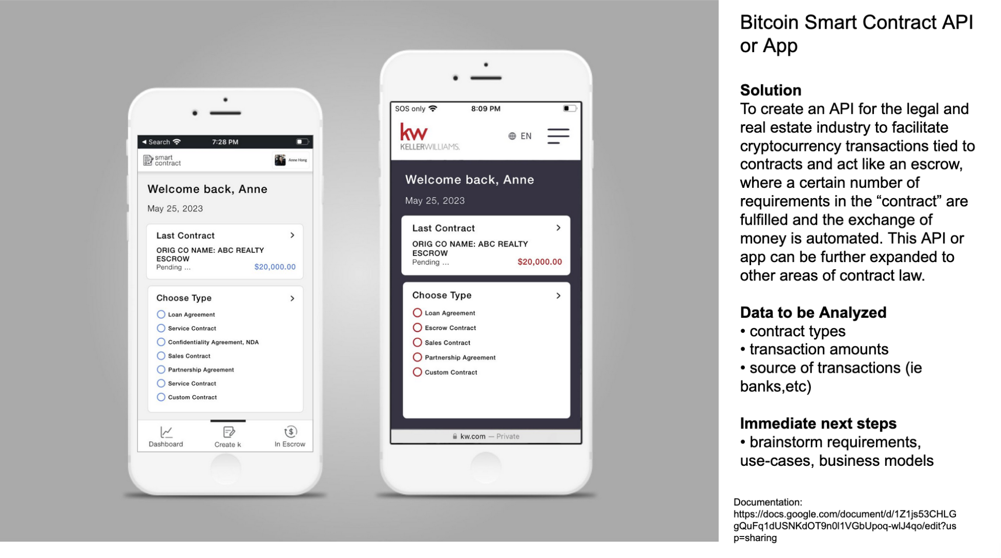 The objective was to democratize contracts, offering individuals or small businesses that do not have access to typical legal services and financial payment systems a way to leverage control over their finances. One prototype that explores Smart Contracts using Ethereum cryptocurrency in the real estate space, and another explores a templated Smart Contracts app using Ripple cryptocurrency.
